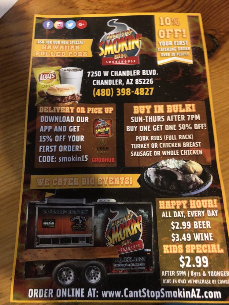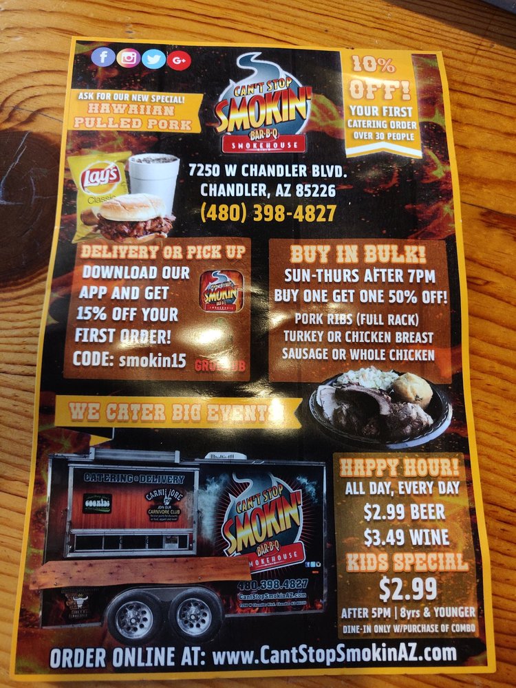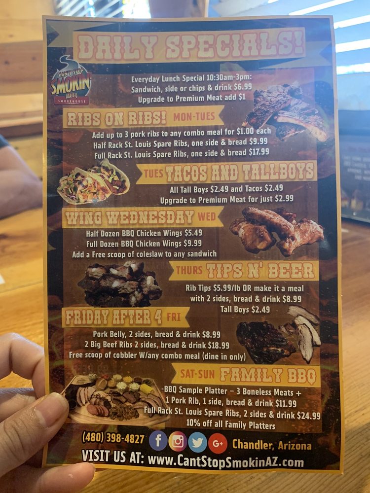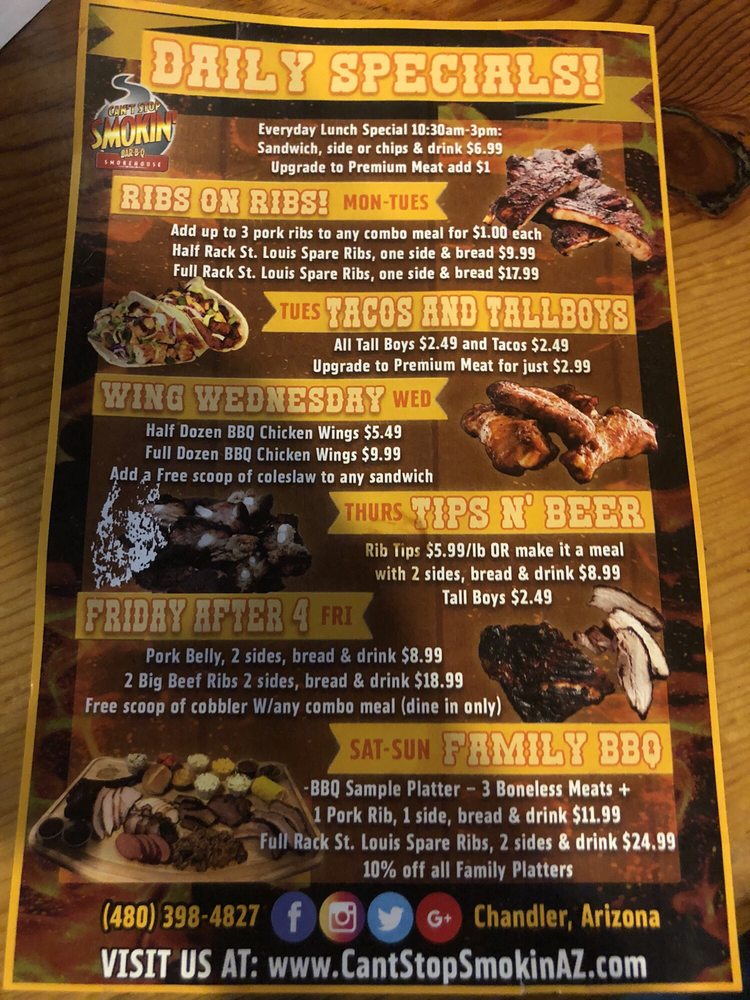Introducing the menu at Cant Stop Smokin BBQ in Chandler, a haven for BBQ lovers seeking fresh, flavorful dishes. This locally owned establishment offers a variety of options, including shredded chicken BBQ sandwiches, carnitas, and brisket. Customers rave about the quick service, affordable prices, and the option to customize their meals with a topping bar and choice of BBQ sauce. The lunch specials are a standout, with deals like a sandwich, chips, and a drink for $6.99. Vegetarian options are plentiful, and the sides like corn on the cob, cooked carrots, and potato salad are praised for their deliciousness. Guests can enjoy their meals in a casual setting with outdoor seating and free Wi-Fi. Don't miss out on the opportunity to indulge in tender smoked meats and savory sides at Cant Stop Smokin BBQ - Chandler.