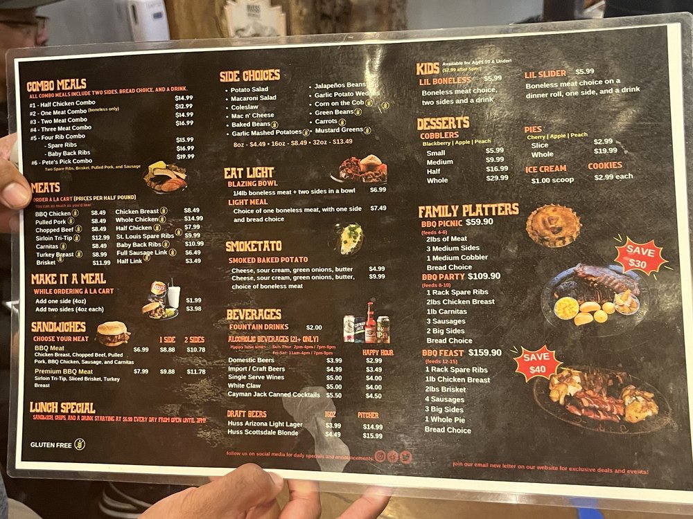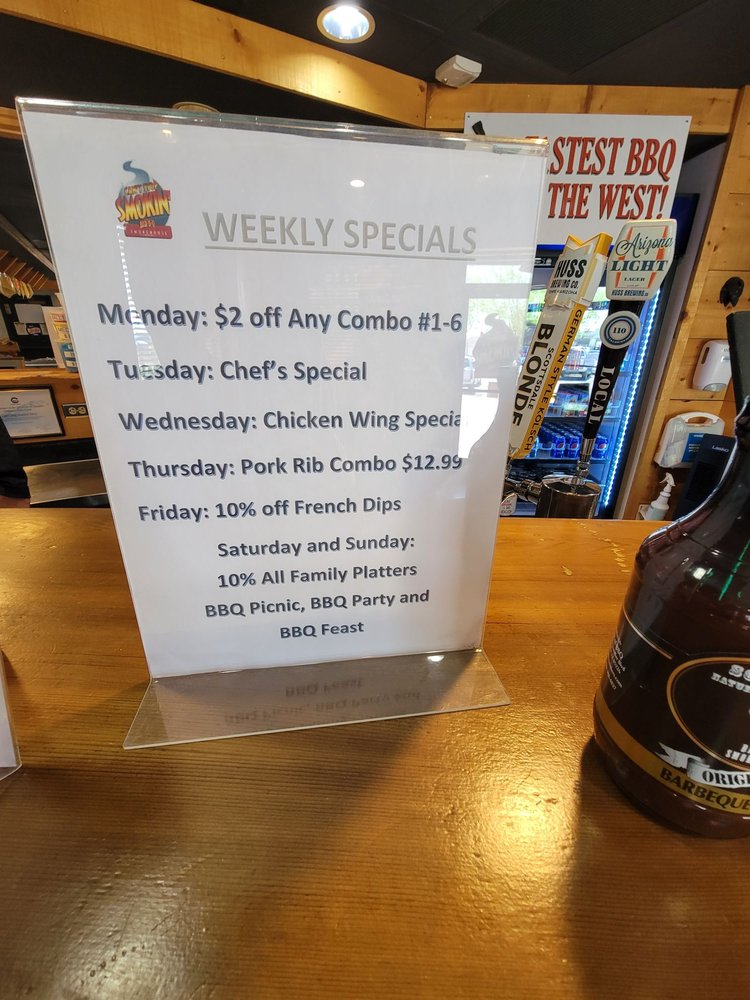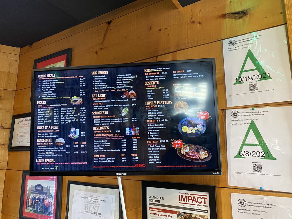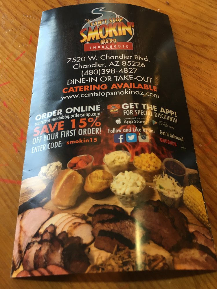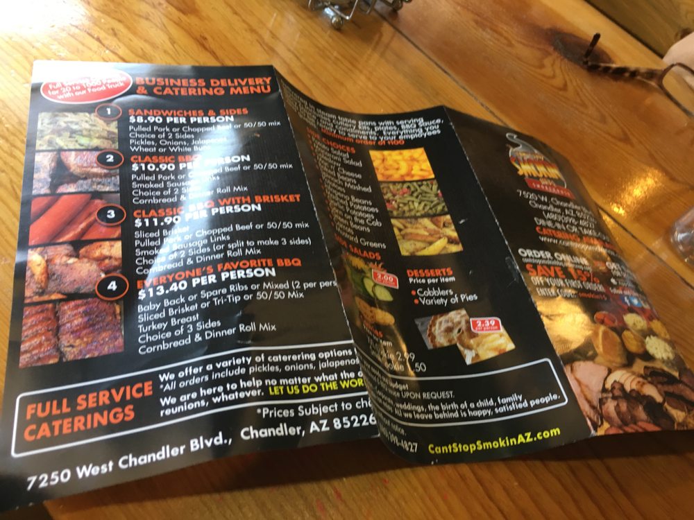 Introducing the menu at Cant Stop Smokin BBQ in Chandler, a haven for BBQ lovers seeking fresh, flavorful dishes. This locally owned establishment offers a variety of options, including shredded chicken BBQ sandwiches, carnitas, and brisket. Customers rave about the quick service, affordable prices, and the option to customize their meals with a topping bar and choice of BBQ sauce. The lunch specials are a standout, with deals like a sandwich, chips, and a drink for $6.99. Vegetarian options are plentiful, and the sides like corn on the cob, cooked carrots, and potato salad are praised for their deliciousness. Guests can enjoy their meals in a casual setting with outdoor seating and free Wi-Fi. Don't miss out on the opportunity to indulge in tender smoked meats and savory sides at Cant Stop Smokin BBQ - Chandler.